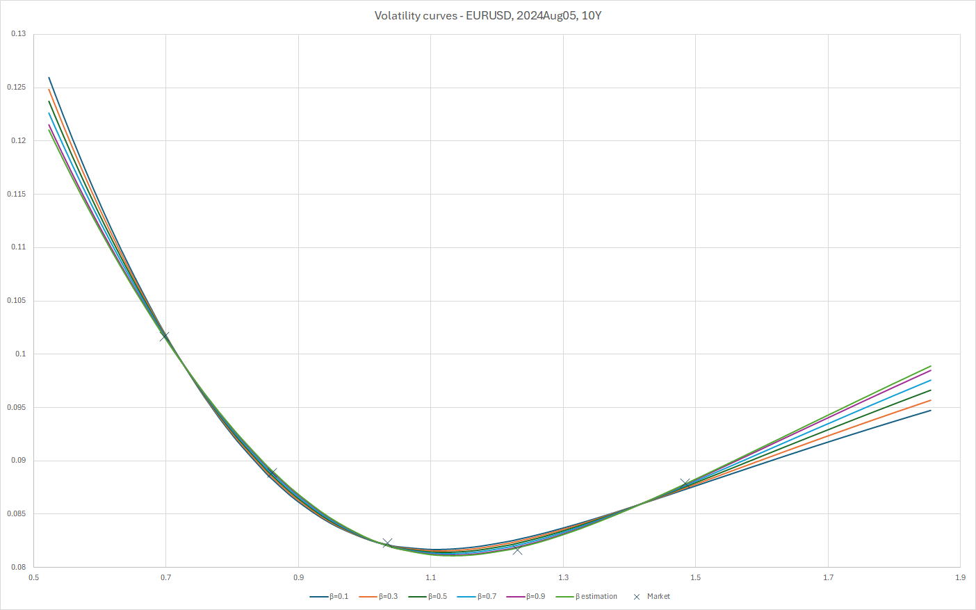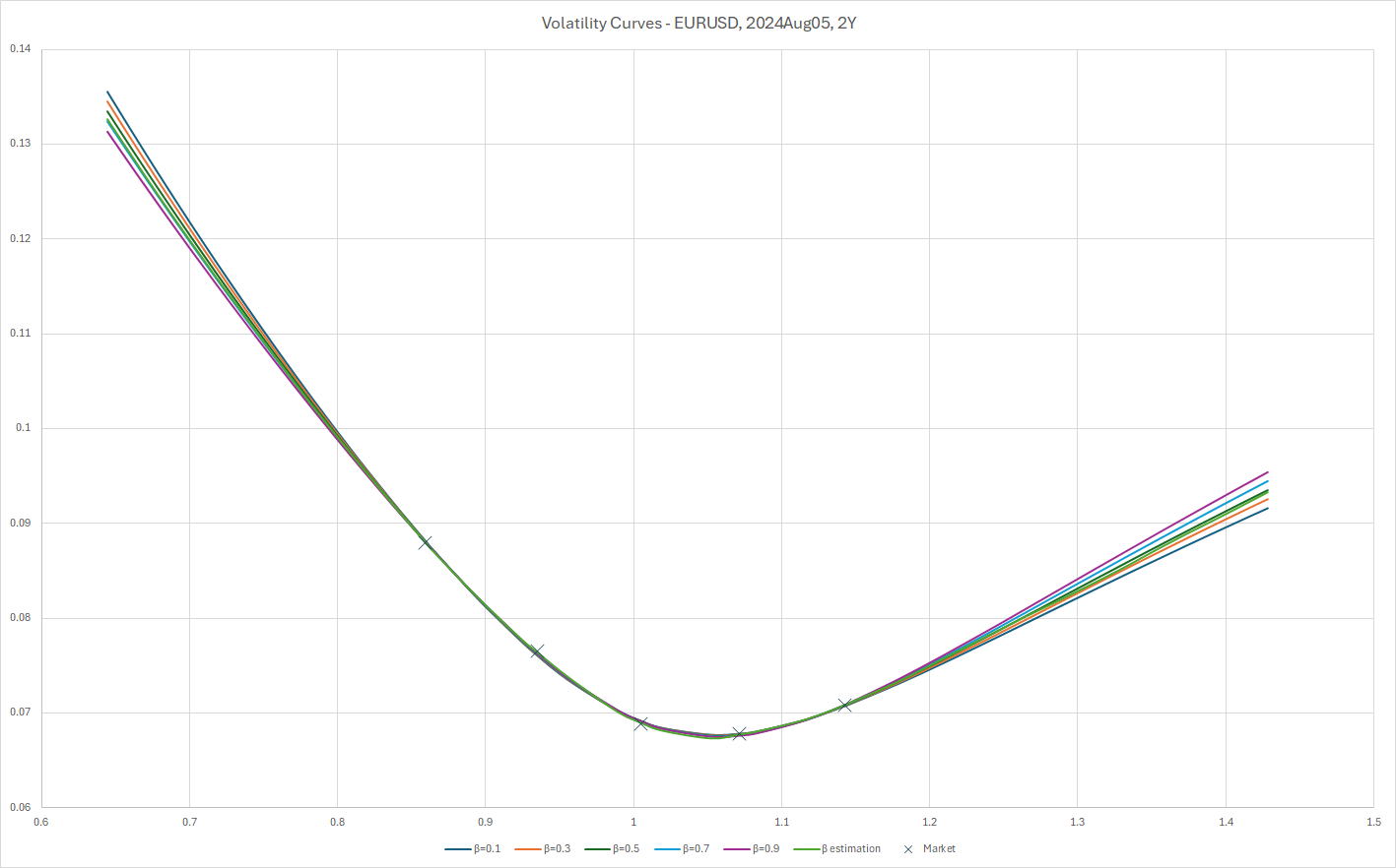 Figure 6 各βでのボラティリティカーブ/Volatility Curves for βs, EURUSD 2024Aug05 – 10Y