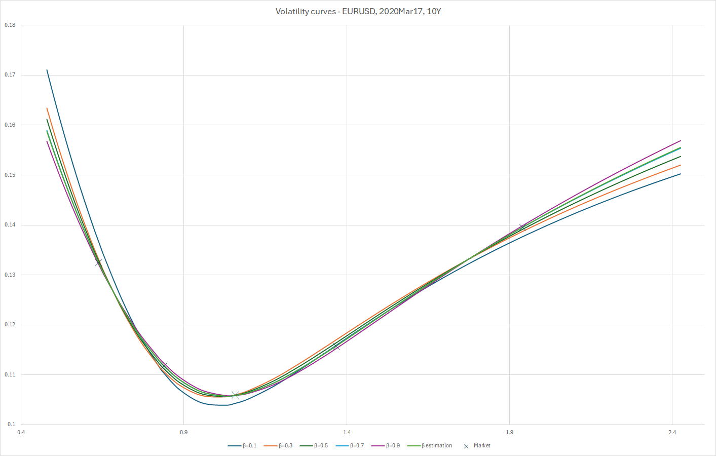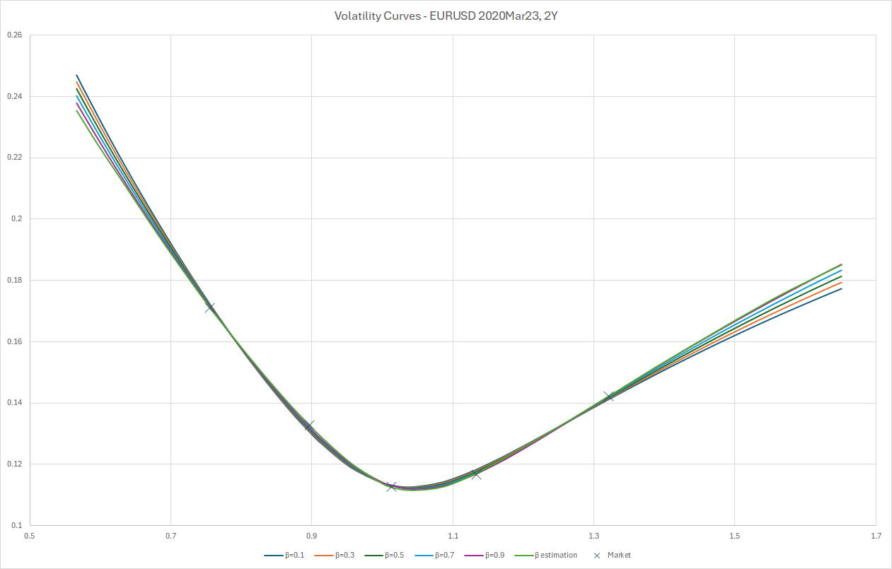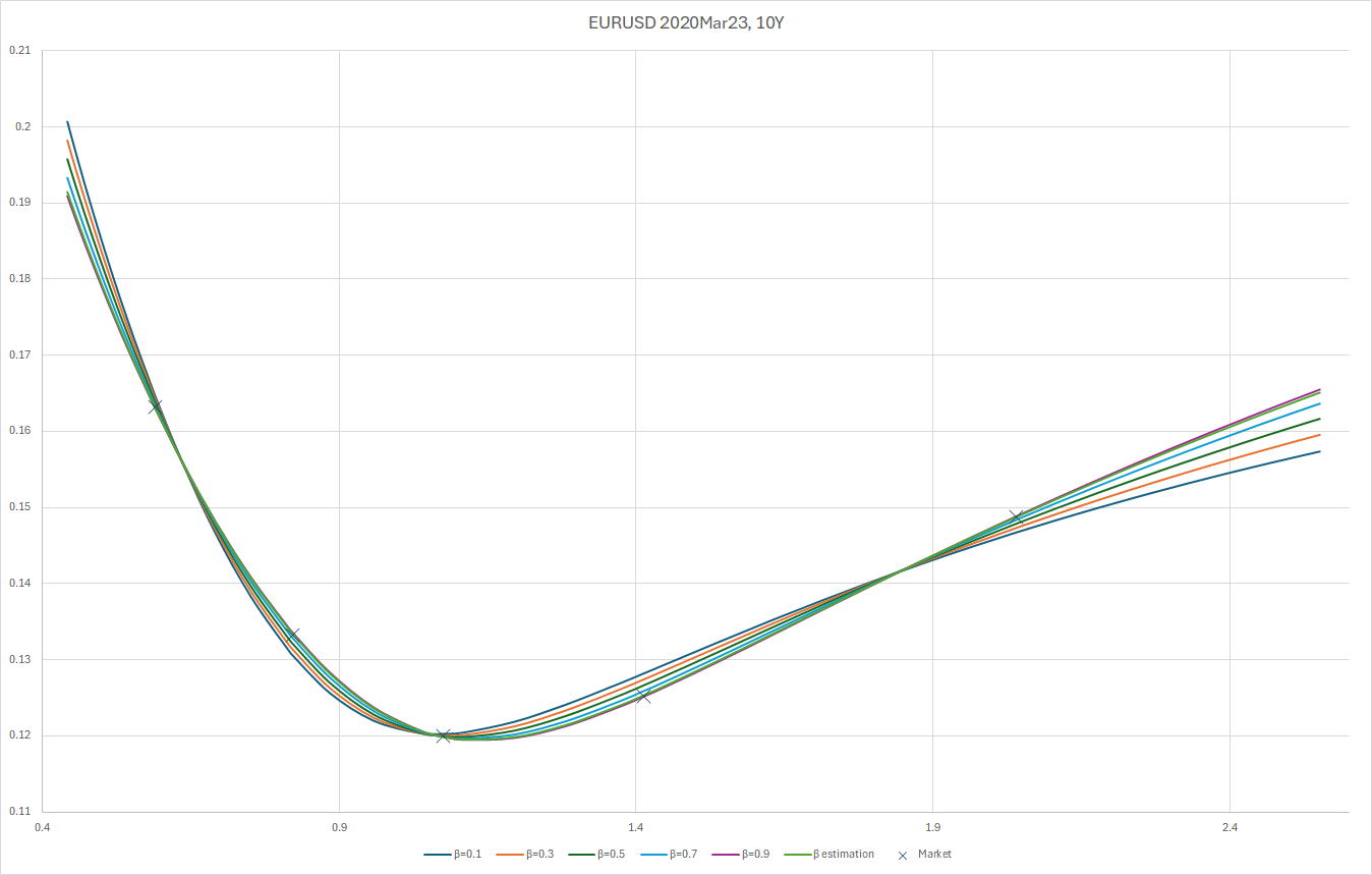 Figure 4 各βでのボラティリティカーブ/Volatility Curves for βs, EURUSD 2020 Mar17 – 10Y