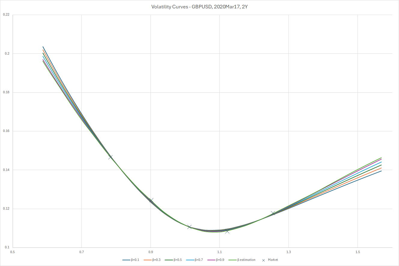 Figure 7 各βでのボラティリティカーブ/Volatility Curves for βs, GBPUSD 2020Mar17 – 2Y