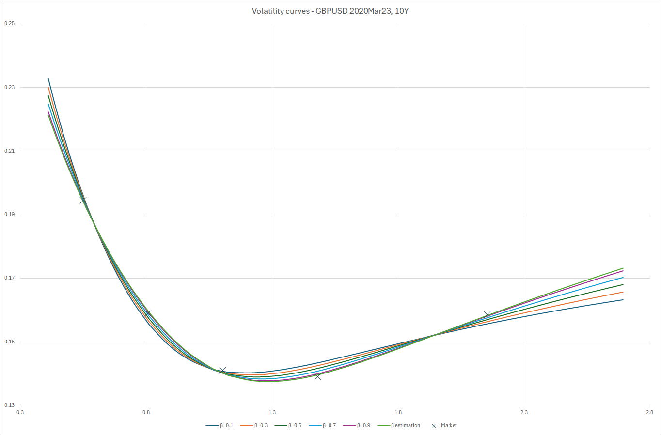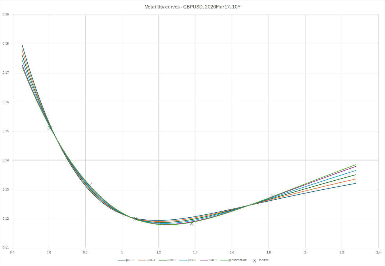 Figure 11 各βでのボラティリティカーブ/Volatility Curves for βs, GBPUSD 2020Mar23 – 10Y