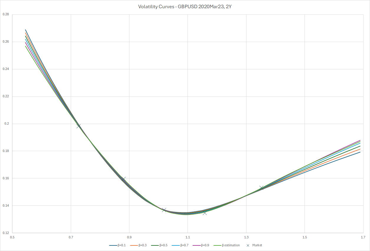 Figure 8 各βでのボラティリティカーブ/Volatility Curves for βs, GBPUSD 2020Mar23 – 2Y