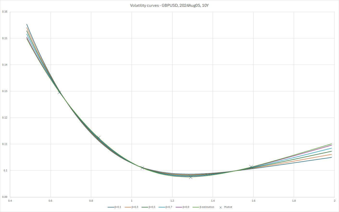 Figure 12 各βでのボラティリティカーブ/Volatility Curves for βs, GBPUSD 2024Aug – 10
