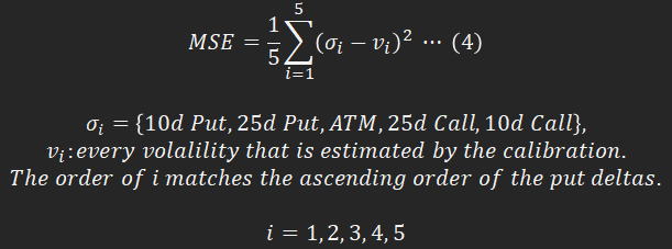 市場ボラティリティ10-delta Put, 25-delt Put, ATM, 25-delta Call, 10-delta Callの5点に対し、最小二乗法を適用してボラティリティカーブが適合するようキャリブレーションを実行する。各βの平均二乗誤差(MSE)で適合具合を比較する。数式は下記(4)。